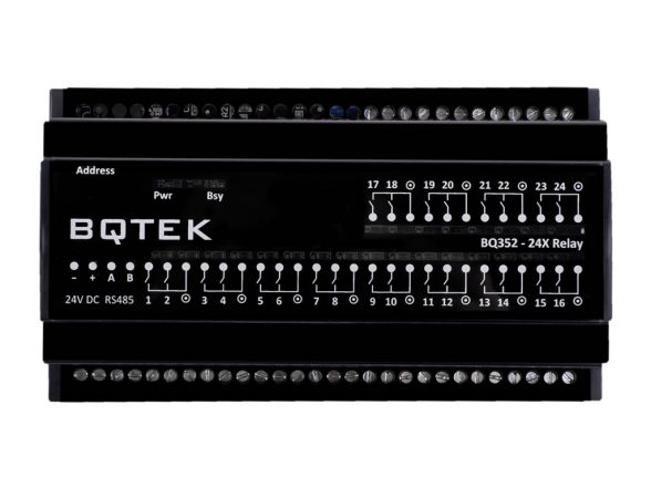 BQ352 Modbus röle çıkış cihazıdır. RS485 Modbus RTU üzerinden röle durumlarını öğrenmenizi ve kontrol etmenizi sağlar. Cihaz üzerinde 24 adet röle çıkışı bulunur.